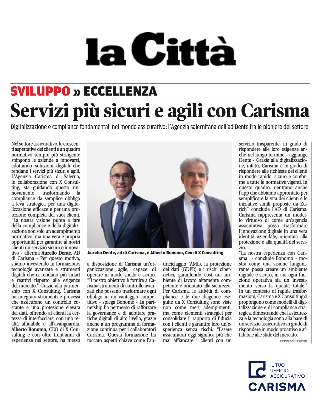 “La nostra visione punta a fare della compliance e della digitalizzazione non solo un adempimento normativo, ma una vera e propria opportunità per garantire ai nostri clienti un servizio sicuro e innovativo” afferma Aurelio Dente, AD di Carisma